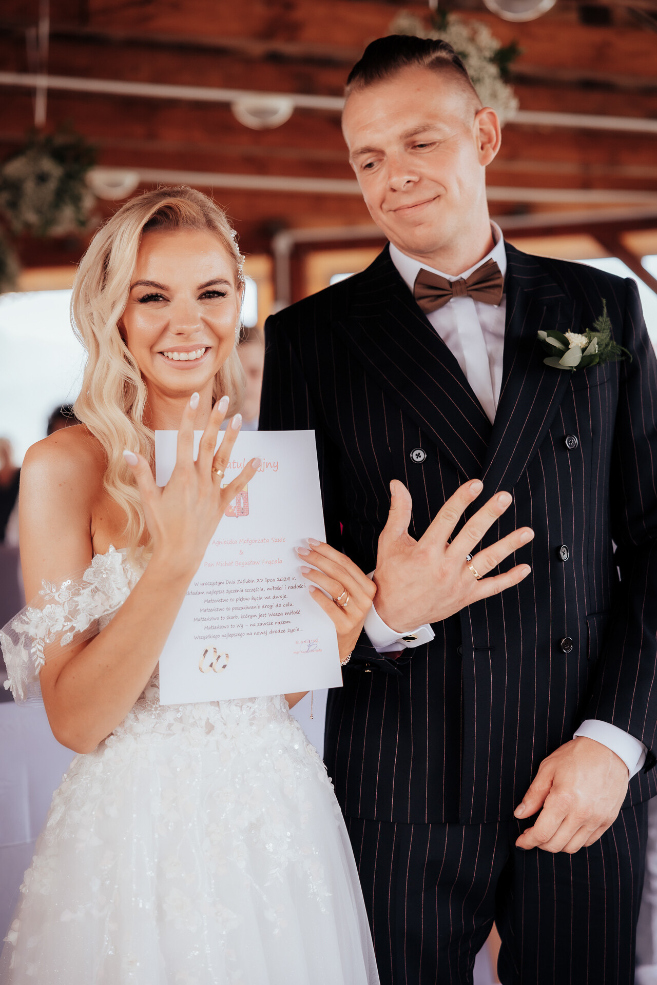 Ola, w szytej na miarę sukni i welonie od projektantki, zachwycała subtelną kobiecością, a Sebastian,w klasycznym garniturze, dopełniał tę harmonię stylu.
